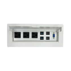 Es ideal para salas de junta, oficinas, espacios de trabajo, su sistema de apertura es manual mediante una puerta que nos ayuda a ocultar los contactos cuando no son utilizados. Fabricado en Acero con recubrimiento de pintura electrostática las cual nos ayuda a proteger la calidad y tiempo de vida del color.
