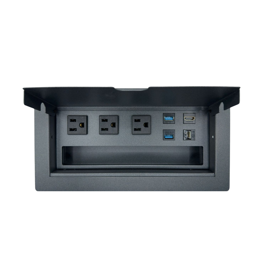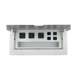 Es ideal para salas de junta, oficinas, espacios de trabajo, su sistema de apertura es manual mediante una puerta que nos ayuda a ocultar los contactos cuando no son utilizados. Fabricado en Acero con recubrimiento de pintura electrostática las cual nos ayuda a proteger la calidad y tiempo de vida del color.